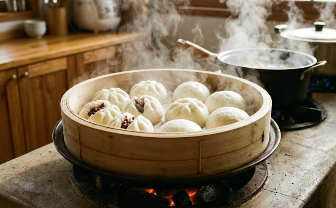 밀가루 반죽에 속을 넣고 찐 전통 음식이에요