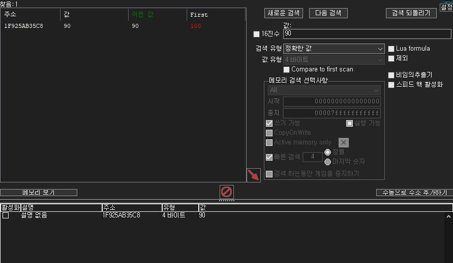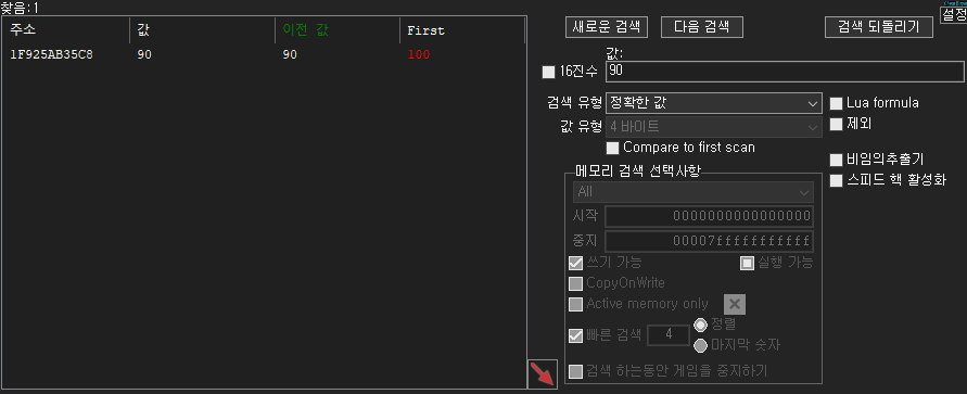 6. 정확한 주소를 찾기 위해 실행중인 게임&프로그램 내부에서 찾으려는 값을 임의의 값으로 변경 (여기선 임의로 '90' 이라고 가정)