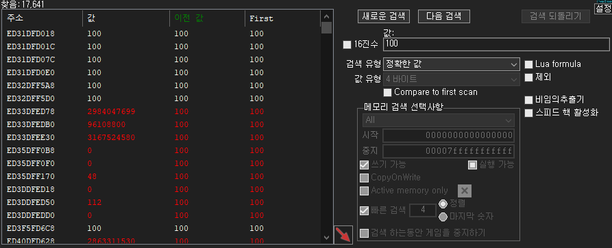 4. 수치를 변경하고 싶은 값의 현재 값을 입력 후 '처음 검색' 클릭 (여기선 임의로 '100' 이라고 가정)